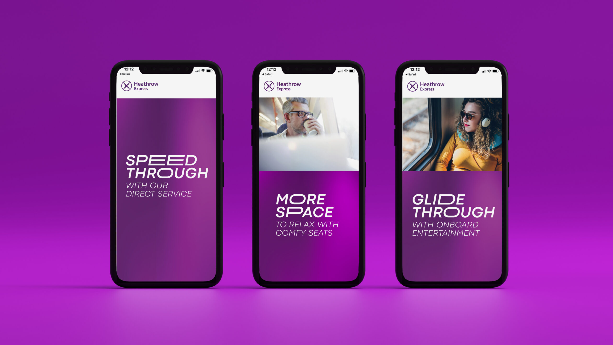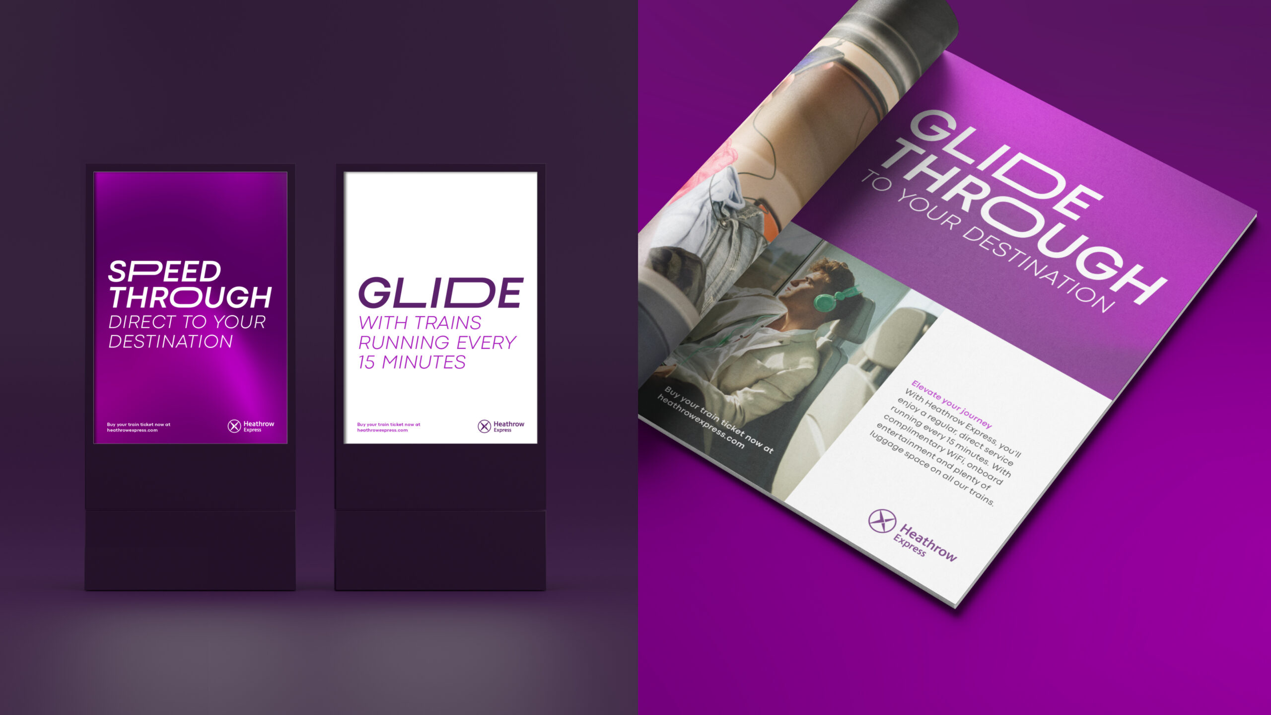 The design principle to ‘elevate’ also informed our approach to typography. A custom typeface, called HEx, enabled extended characters to be embedded within the typeface. Creating greater visual impact for emotive campaign messaging, further bringing to life a more expressive brand built around key service features such a speed, space and seamless travel.