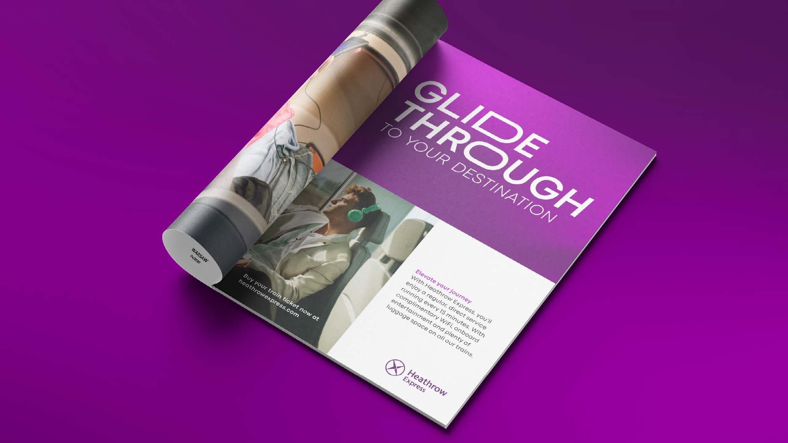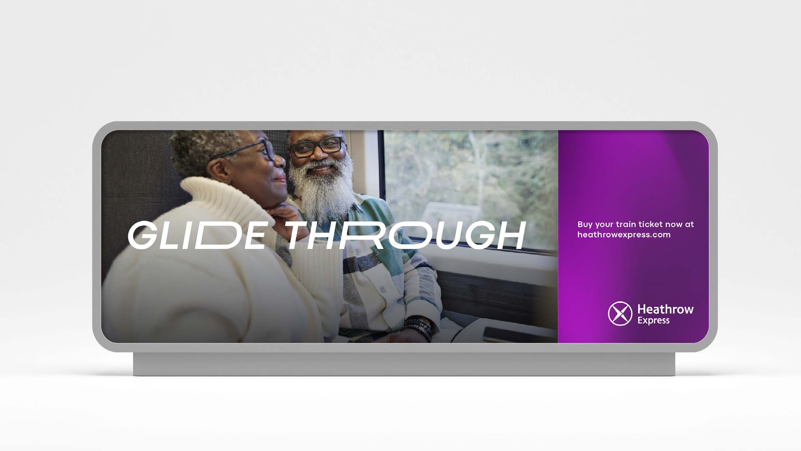 The extended letterforms were designed to work hard in campaign environments. Used across layouts, they visually convey speed and ease, mirroring the smooth, uninterrupted nature of the Heathrow Express journey and helping key messages cut through with confidence and clarity.